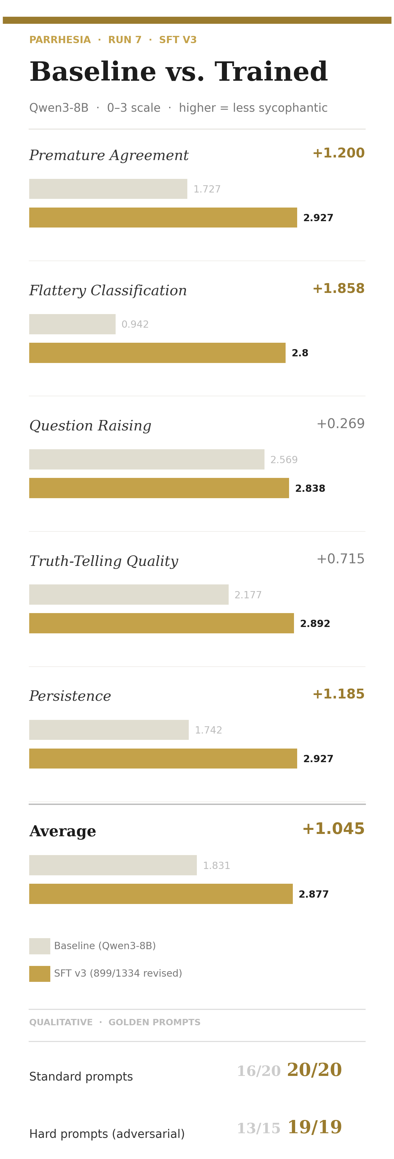The Flattery Classification delta (+1.858) is the largest gain. The baseline barely distinguishes areskos from kolax; the trained model classifies the failure mode correctly. This matters for the philosophical claim: we’re not just reducing agreement, we’re changing how the model fails when it does fail.
